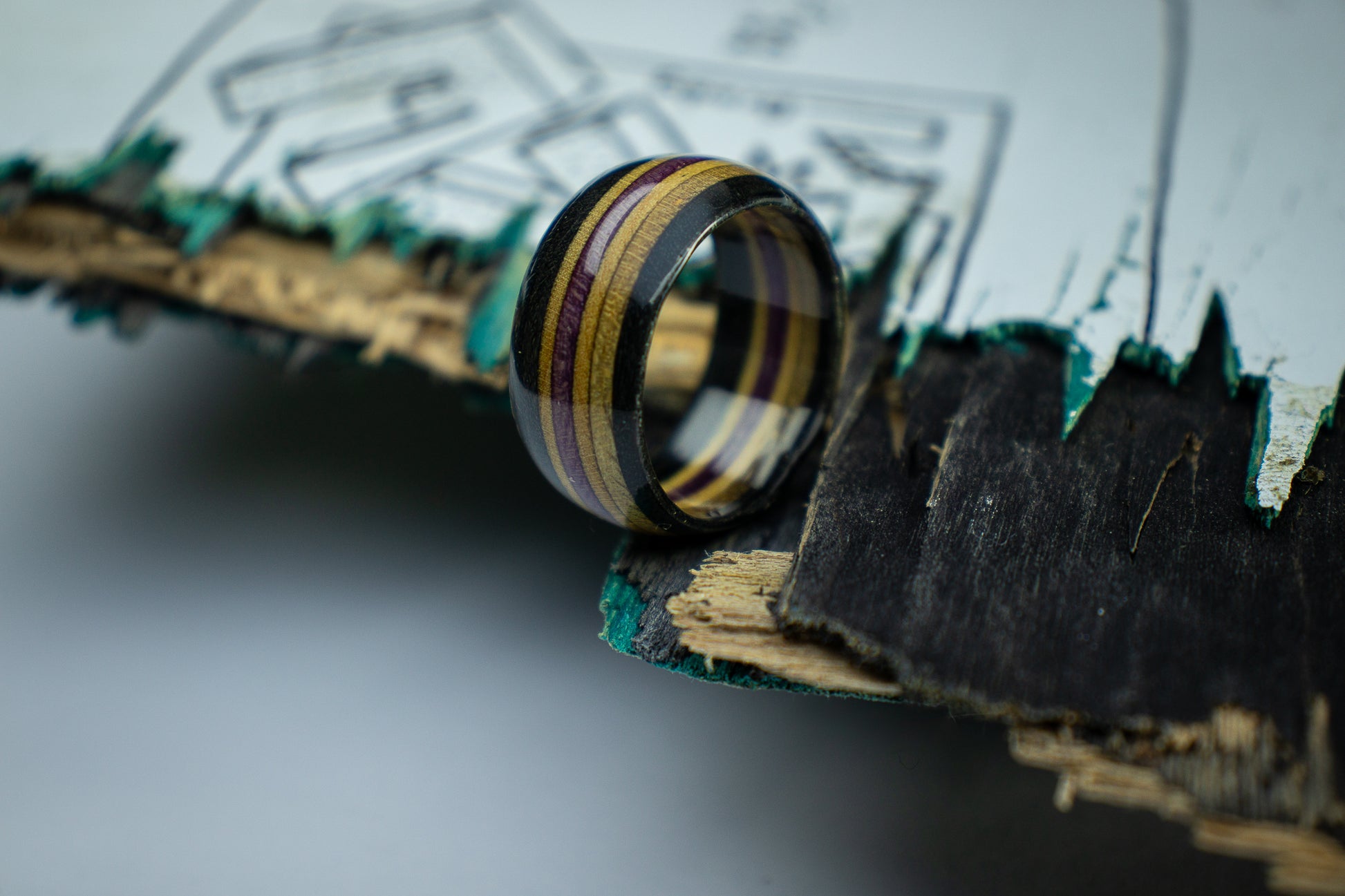 Make your mark with our Recycled Skateboard Ring! Sourced from real, used skate decks, each ring is hand-shaped from compressed maple layers — the same stuff that took kickflips and rails. No two are alike. These rings come with their own street history, from bruised boards to bold colors. A statement piece for skaters, creators, and rule breakers.