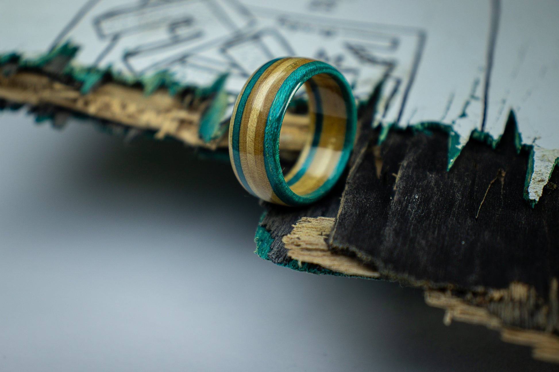 Make your mark with our Recycled Skateboard Ring! Sourced from real, used skate decks, each ring is hand-shaped from compressed maple layers — the same stuff that took kickflips and rails. No two are alike. These rings come with their own street history, from bruised boards to bold colors. A statement piece for skaters, creators, and rule breakers.