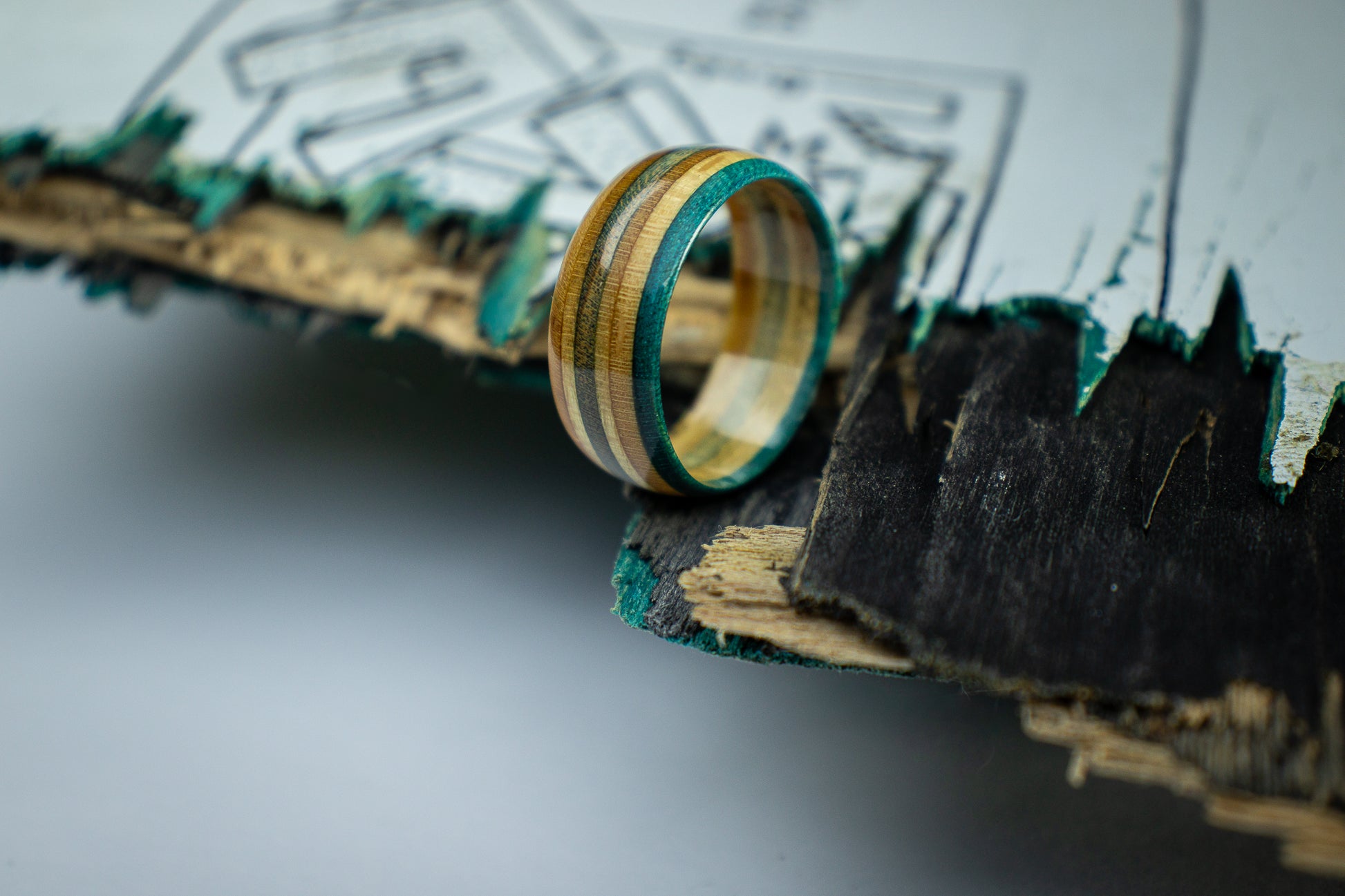 Make your mark with our Recycled Skateboard Ring! Sourced from real, used skate decks, each ring is hand-shaped from compressed maple layers — the same stuff that took kickflips and rails. No two are alike. These rings come with their own street history, from bruised boards to bold colors. A statement piece for skaters, creators, and rule breakers.
