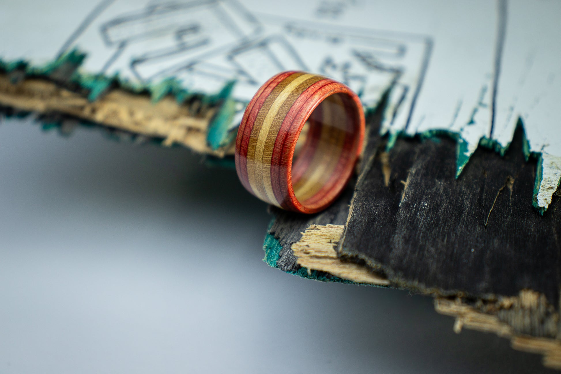 Make your mark with our Recycled Skateboard Ring! Sourced from real, used skate decks, each ring is hand-shaped from compressed maple layers — the same stuff that took kickflips and rails. No two are alike. These rings come with their own street history, from bruised boards to bold colors. A statement piece for skaters, creators, and rule breakers.