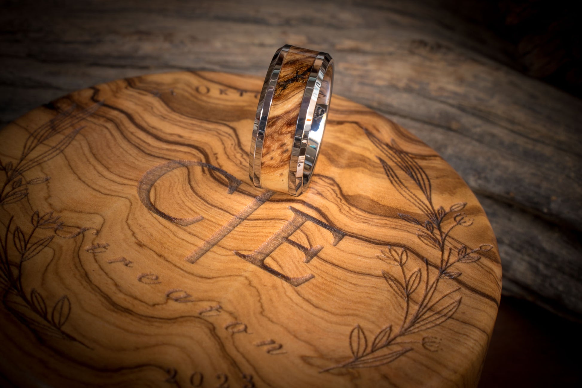 Add some character to your outfit with our Wild Olive Burl Ring. The rare wild olive burl wood is carefully inlayed into a tungsten 8mm core, creating a beautiful grain that will stand out. A unique and scarce piece for those who want to stand out from the crowd.